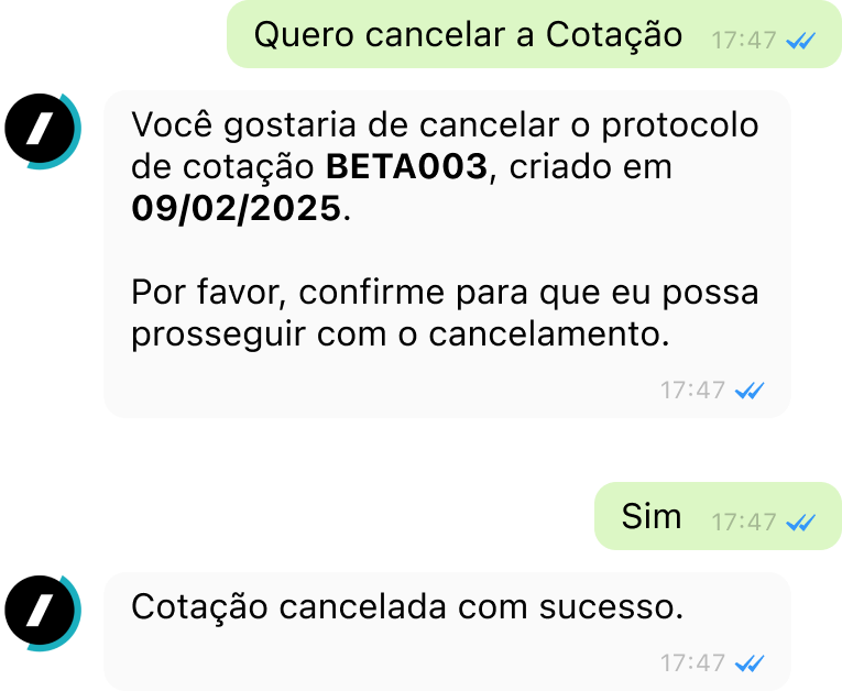 - Diga (em texto ou voz) que você deseja cancelar a cotação.