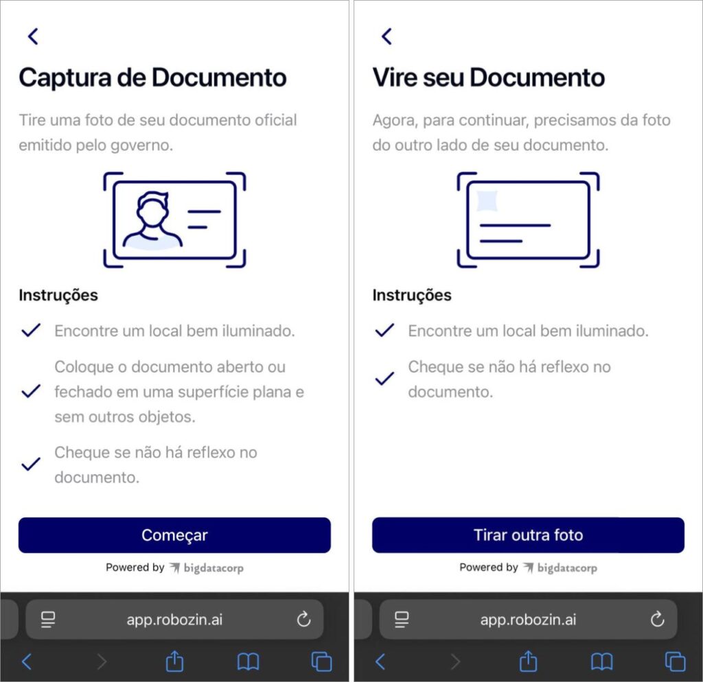 Após o reconhecimento facial, será solicitada uma foto do seu documento.