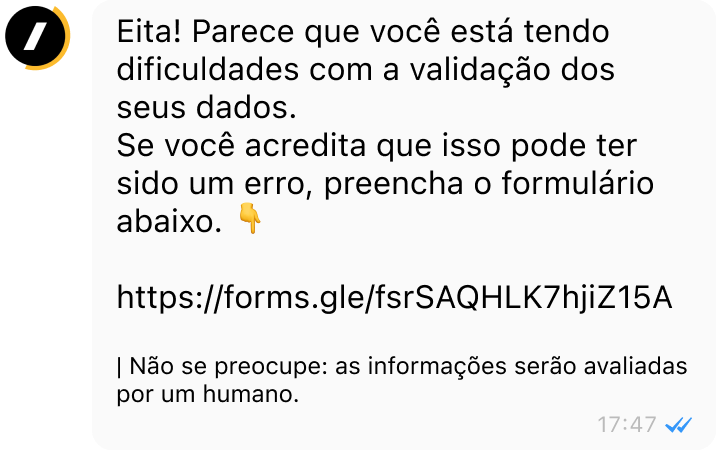Se isso acontecer, basta preencher o formulário de Suporte Especial para Validação dos Documentos. Nossa equipe fará a análise manualmente por um atendente humano.