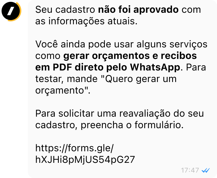 A imagem abaixo ilustra a negativa do processo de validação de documentos no Robozin PRO.